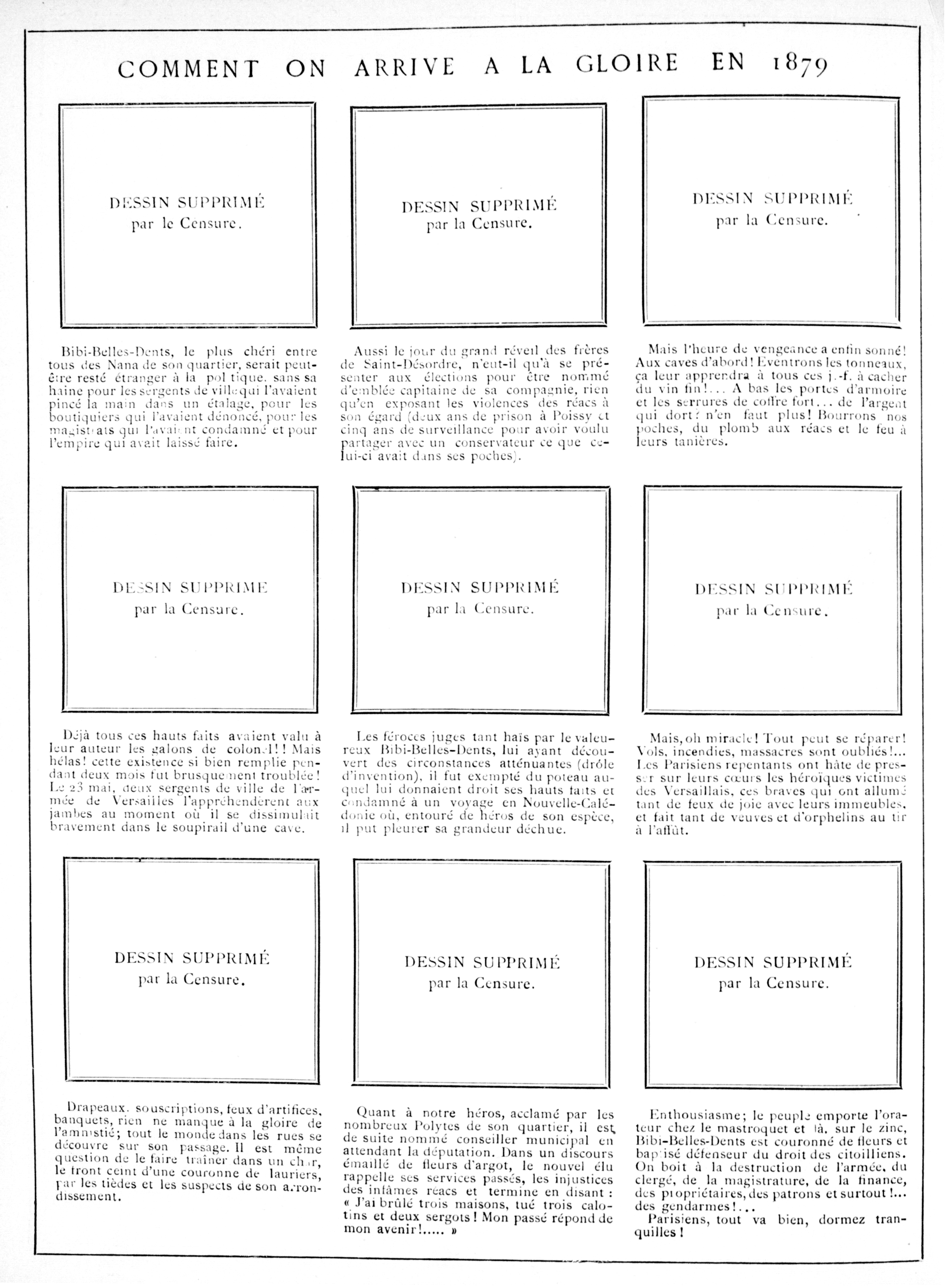 La censure, que subit régulièrement le journal, est le thème des deux planches suivantes publiées en juillet 1879 (à lire de haut en bas et de gauche à droite) :