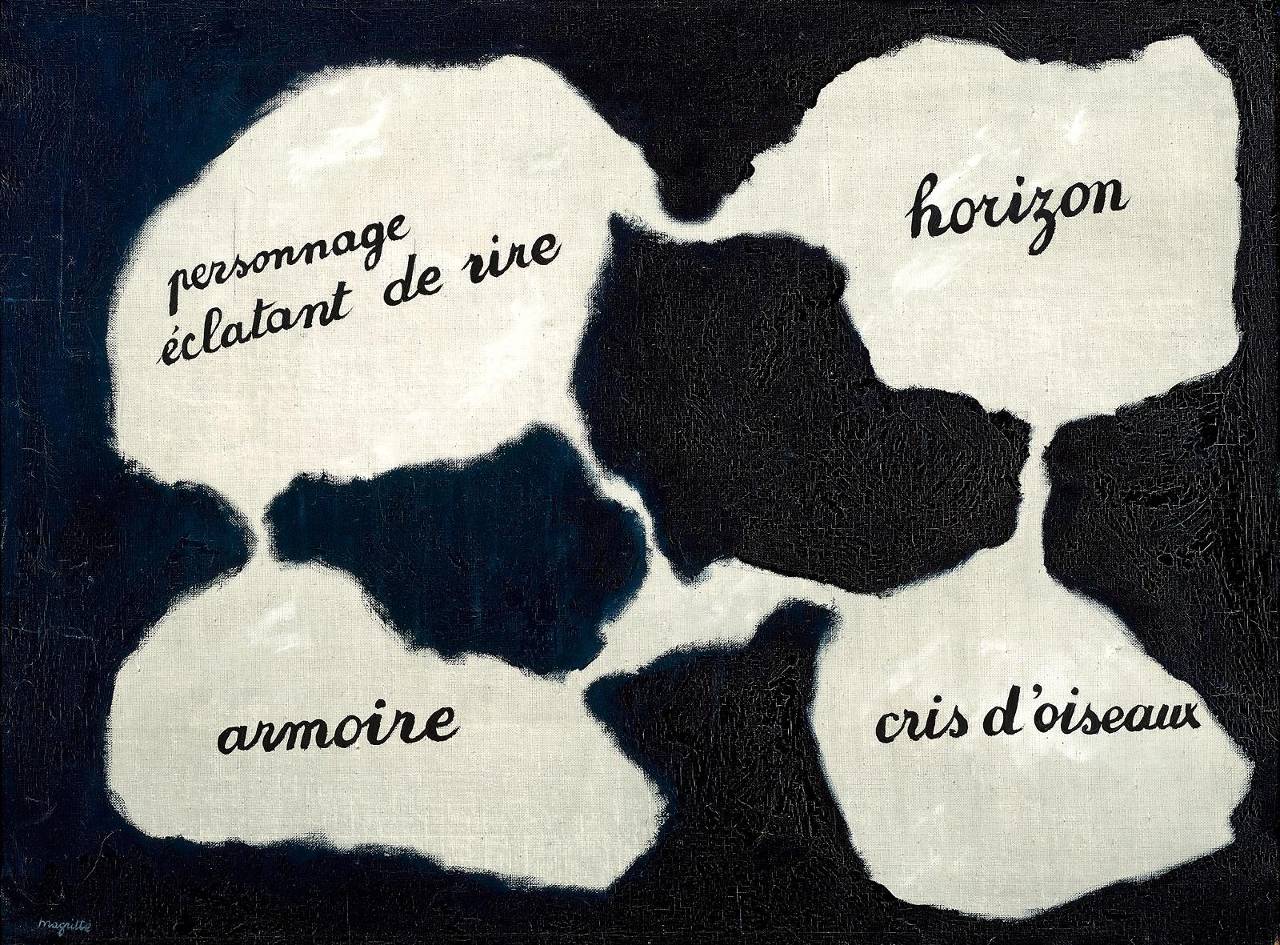 9. Cette série est notamment composée des tableaux suivants : L’usage de la Parole (1927), L’Espoir rapide (1927), Le Masque vide (1928), Le Corps bleu (1928), Le Miroir vivant (1928-1929), L’Arbre de la Science (1929) ou encore Le Miroir magique (1929). Magritte fera la synthèse de ses expérimentations dans un texte illustré paru dans La Révolution surréaliste en décembre 1929 sous le titre « Les Mots et les images ».[]