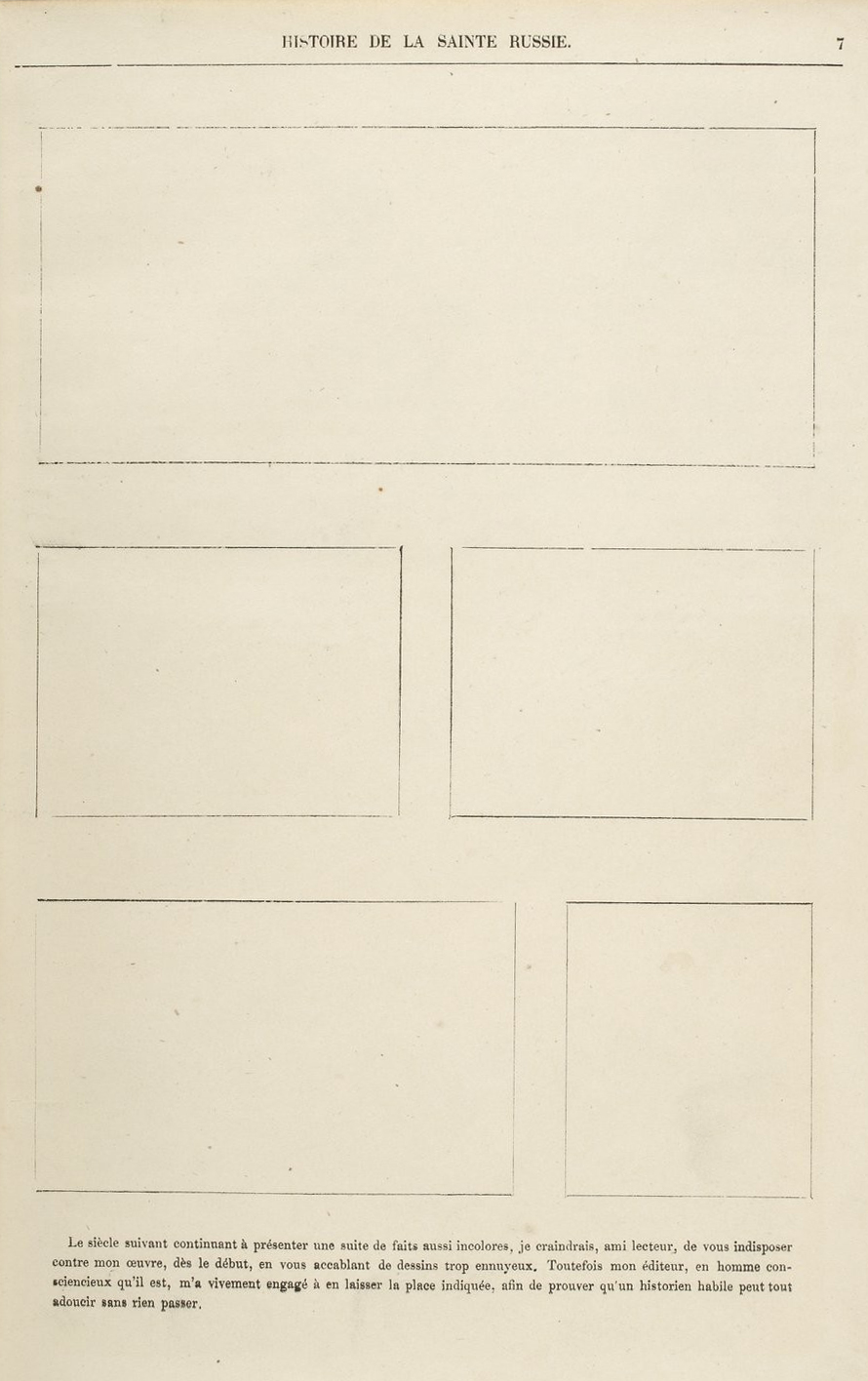 Ainsi purgée des dessins défendus, cette singulière bande dessinée n’est pas sans rappeler celle uniquement composée de cinq vignettes vides, sans légendes, que Gustave Doré proposa dans son Histoire de la sainte Russie (1854) :