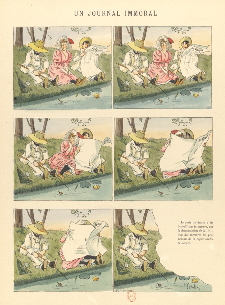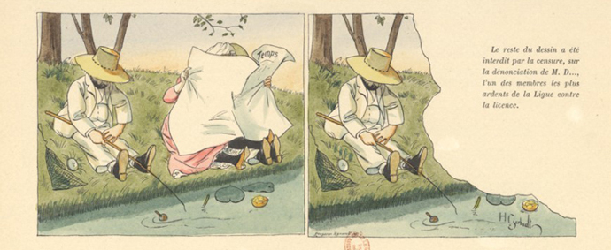 Parmi les sujets favoris du dessinateur Henry Gerbault figurent les femmes parisiennes de la Belle Époque, mais aussi les maris cocus. Comme l’écrit Lefranc de Roscoff (6) : « L’illustre caricaturiste débordait de malice lorsqu’il fallait frôler la grivoiserie sans froisser les dentelles ni les conventions mondaines de la société. » Dans ses histoires parues dans la revue La Vie parisienne, reprises dans son recueil Parisiennettes (1894), il cache les scènes licencieuses à l’aide de divers artifices graphiques, comme la feuille de vigne ou le paravent que nous avons déjà vus. Plus original, ce trompe-l’œil final fait croire qu’une partie de l’image a été déchirée par la censure :
