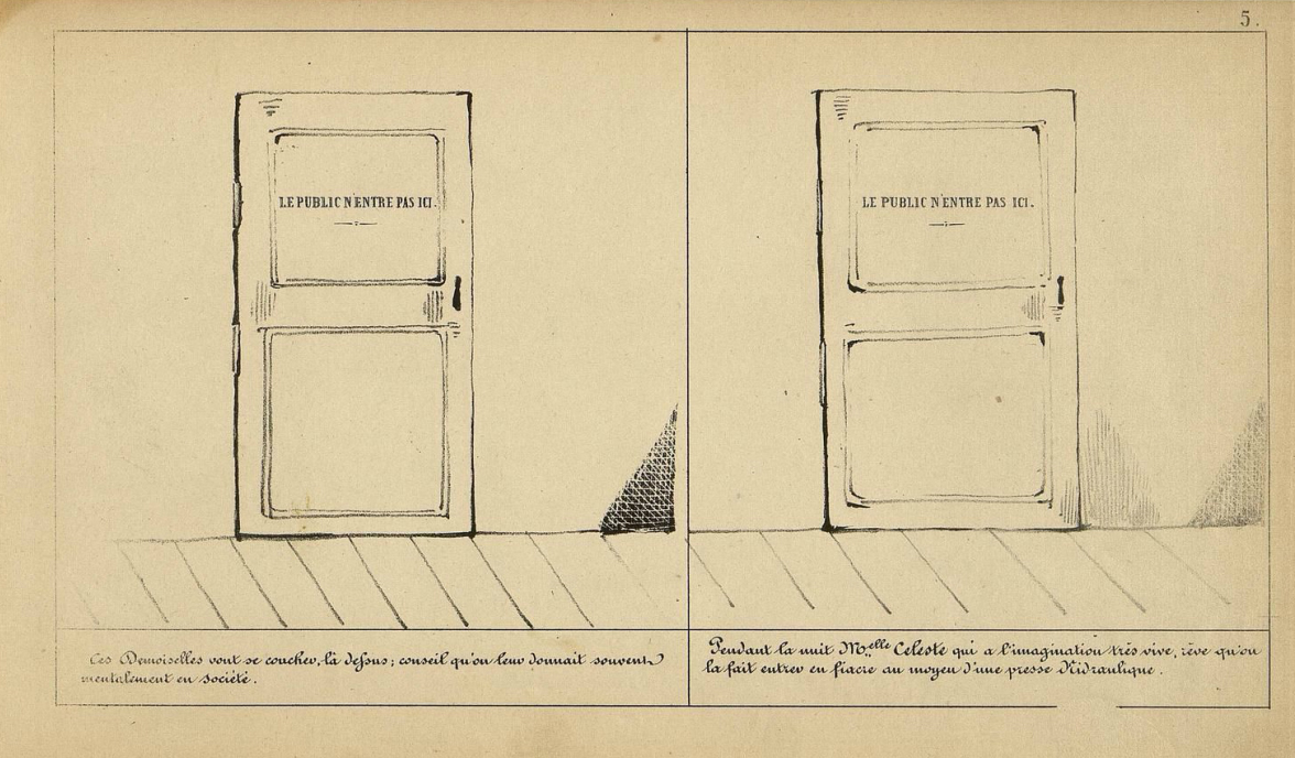 Un autre moyen pour Cham de respect de l’intimité de ses personnages consiste à les cacher derrière un élément qui occulte la scène. Toujours dans l’album Deux vieilles filles, les représentations répétées de portes fermées, derrières lesquelles se trouvent les chambres de demoiselles, permettent à nouveau de ne pas les exposer aux regards indiscrets du lecteur  (3) :