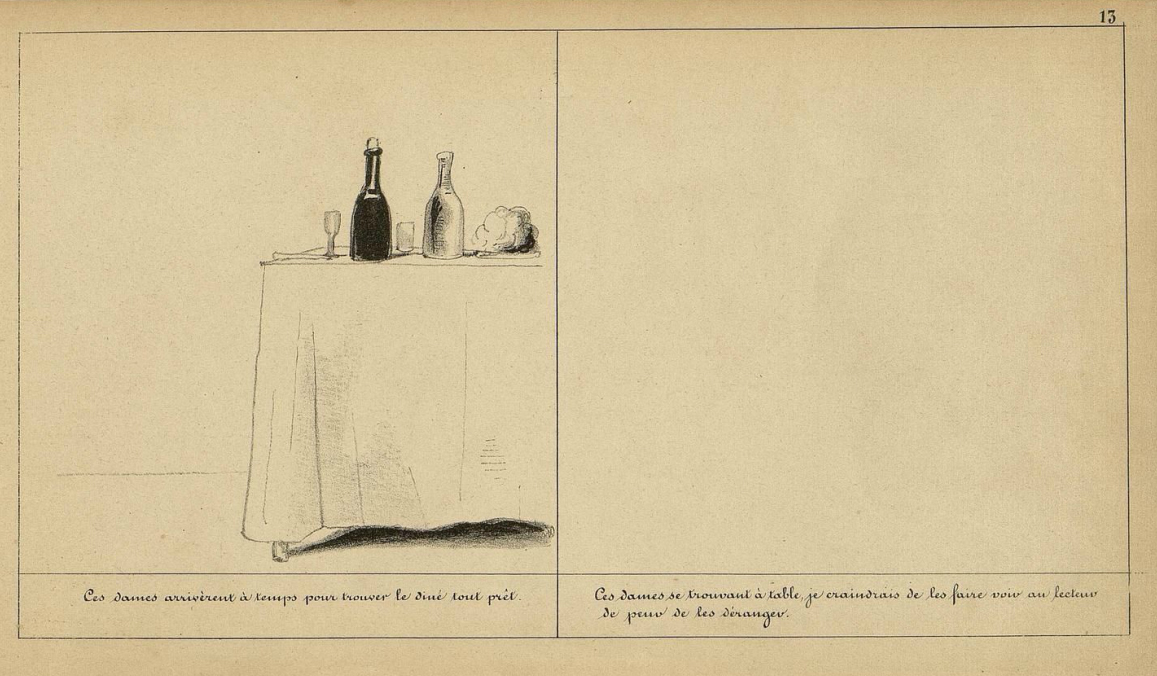 Les cases vides ou vierges font partie de cet arsenal. Avant la page aux cases vides de Doré, Cham avait placé une vignette vierge dans son album Deux vieilles filles vaccinées à marier (1840). En légende, il s’excuse directement auprès de son lecteur : « Ces dames se trouvant à table, je craindrais de les faire voir par les lecteurs de peur de les déranger. »