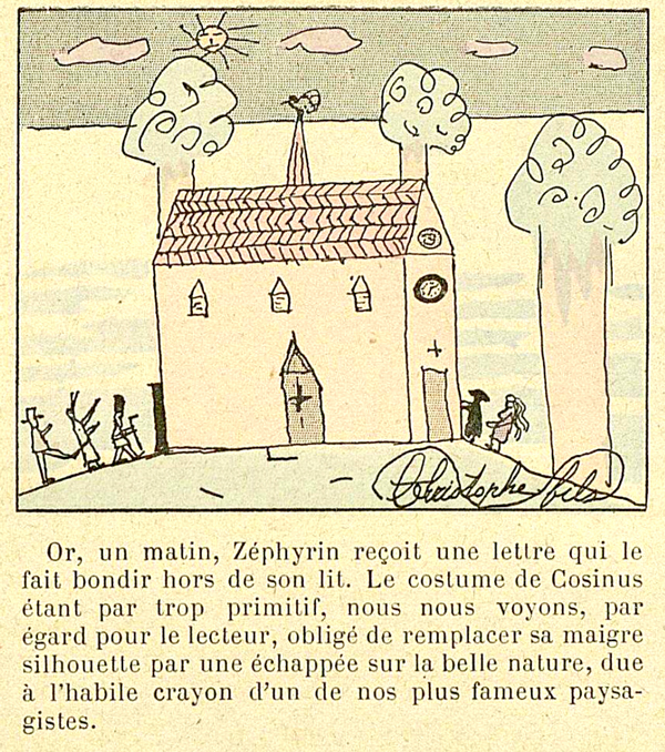 Dans un épisode du Savant Cosinus, Christophe reprendra ce procédé de substitution « par égard à son lecteur ». A la place d’une vision du scientifique en tenue d’Adam, il reproduit un dessin d’enfant, attribué, si l’on en croit la signature, à son fils. La légende qui accompagne cette case explique ce choix dans le plus pur style de la verve  (5) :