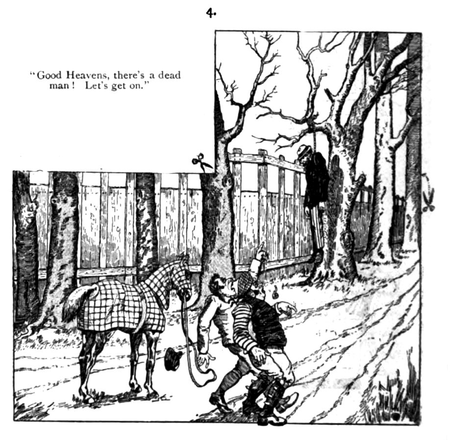 L’intérêt de cette histoire en images qui raconte comment un voleur se fait passer pour un pendu pour effrayer des promeneurs en forêt et les détrousser de leur cheval, réside dans le dispositif original qu’elle propose aux âmes sensibles : des paires de petits ciseaux sont dessinées sur les côtés de deux cases à la forme inhabituelle d’un L en miroir. Elles indiquent au lecteur la possibilité de découper la partie supérieure de ces images. Si l’image est coupée, seuls les jambes du pendu restent visibles, offrant une scène moins « horrible »… La censure est ici facultative et laissée à la liberté du lecteur, qui peut véritablement jouer des ciseaux et se prendre lui-même pour Anastasie.