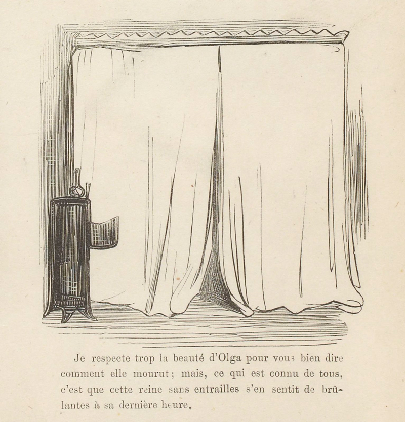 Gustave Doré usera du même stratagème dans son Histoire de la Sainte Russie pour évoquer la fin d’Olga de Kiev, que l’on devine agonisante derrière les grands rideaux fermés de son lit à baldaquin. Doré explique son dessin en légende : « Je respecte trop la beauté d’Olga pour vous bien dire comment elle mourut ; mais, ce qui est connu de tous, c’est que cette reine sans entrailles s’en sentit de brûlantes à sa dernière heure. »