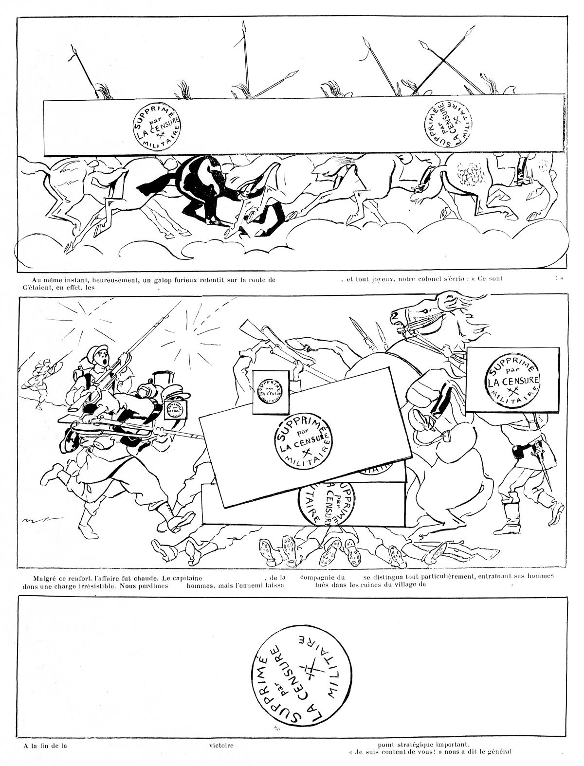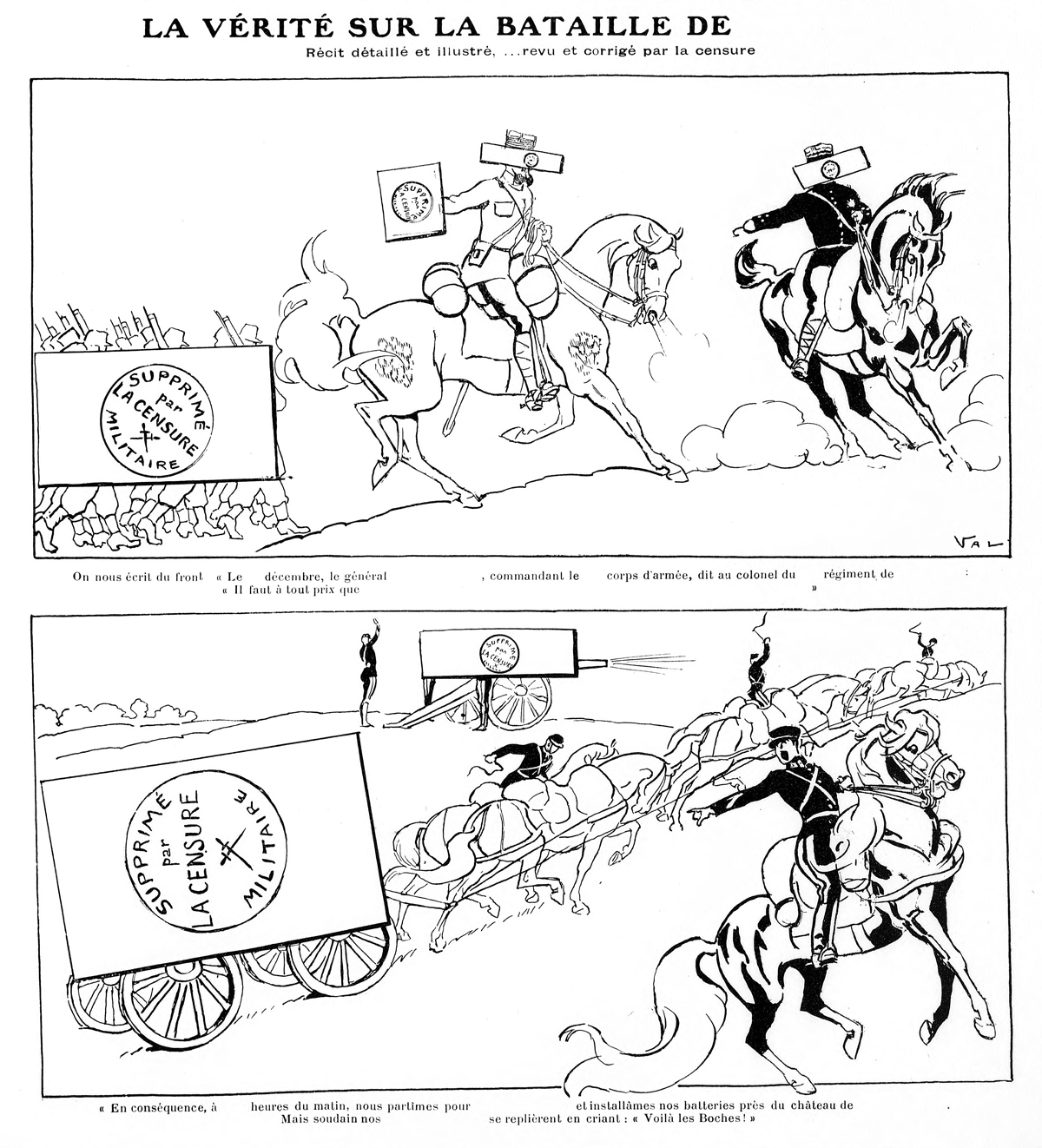 Mise à jour du 21 février 2019 : Nous ajoutons deux nouvelles pièces à cet article. La première est une histoire en images signée Val et  parue dans La Vie parisienne du 19 décembre 1914 : « La vérité sur la bataille de … ». En ce début de la Première Guerre mondiale, le dessinateur s’amuse à cacher de nombreux éléments du texte et de l’image de ce récit militaire (jusqu’à en masquer la dernière vignette dans sa totalité) par des cartons blancs tamponnés par un cachet « Supprimé par la censure militaire ».