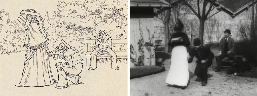 Exemple emblématique de cette relation étroite, le gag de l’arroseur arrosé est apparu de nombreuses fois dans les pages des revues illustrées bien avant de faire l’objet d’une adaptation cinématographique par les frères Lumière en 1895 (2). En regardant avec attention les autres « vues comiques » du catalogue Lumière, d’autres rapprochements peuvent être effectués, de façon plus ou moins évidente, entre ces premiers films (1896-1898) et des histoires parues précédemment dans la presse humoristiques à la même époque.