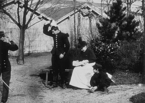 Bonne d’enfants et cuirassier, photogramme du film Lumière (vue n° 102), 1897.