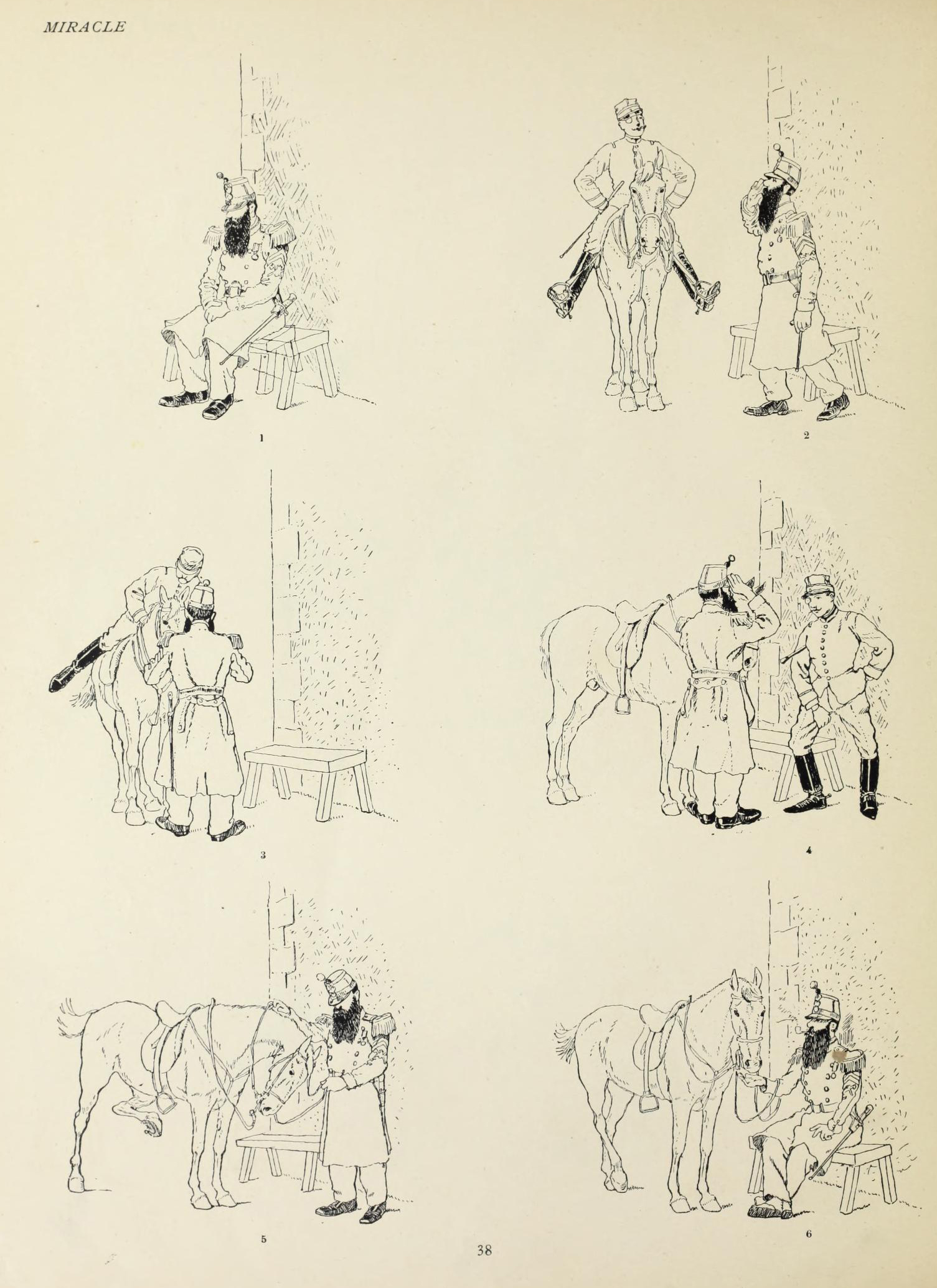 Il ne fait pas de doute que Le planton endormi (vue n° 667) est une adaptation à l’écran de la fameuse histoire sans paroles de Caran d’Ache, « Un Miracle », parue pour la première fois dans La Vie Militaire en 1884 et qui fut de nombreuse fois reprises (5). Le scénario est identique : un soldat s’endort pendant qu’il tient la bride du cheval d’un officier. Des farceurs remplacent discrètement la monture par un petit cheval de bois. Le soldant se réveille sans comprendre ce qu’il lui est arrivé, ni pouvoir l’expliquer à son supérieur (6).