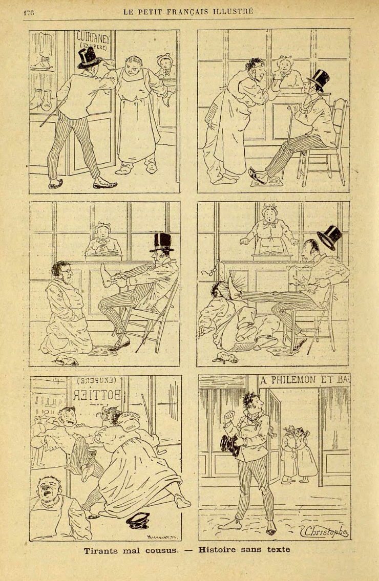 Dans le film Chez le cordonnier (vue n° 753, 1897), « un cordonnier tente de chausser un client qui, dans son effort, le bouscule ». Cette scène, tout aussi classique que la précédente, se retrouve dans l’une des histoires sans paroles que Christophe a dessiné pour Le Petit Français illustré en 1889 :