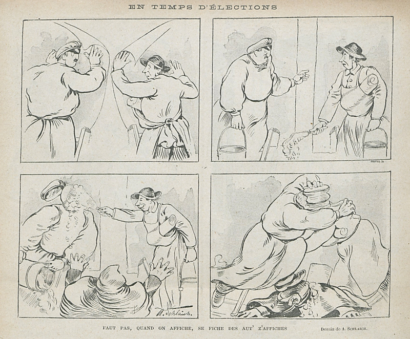 La bataille de colleurs d’affiches filmée dans la vue n° 677 des frères Lumière datée de 1897 peut également se rapprocher de la séquence dessinée par Alfred Schlaich dans Le Rire l’année précédente.