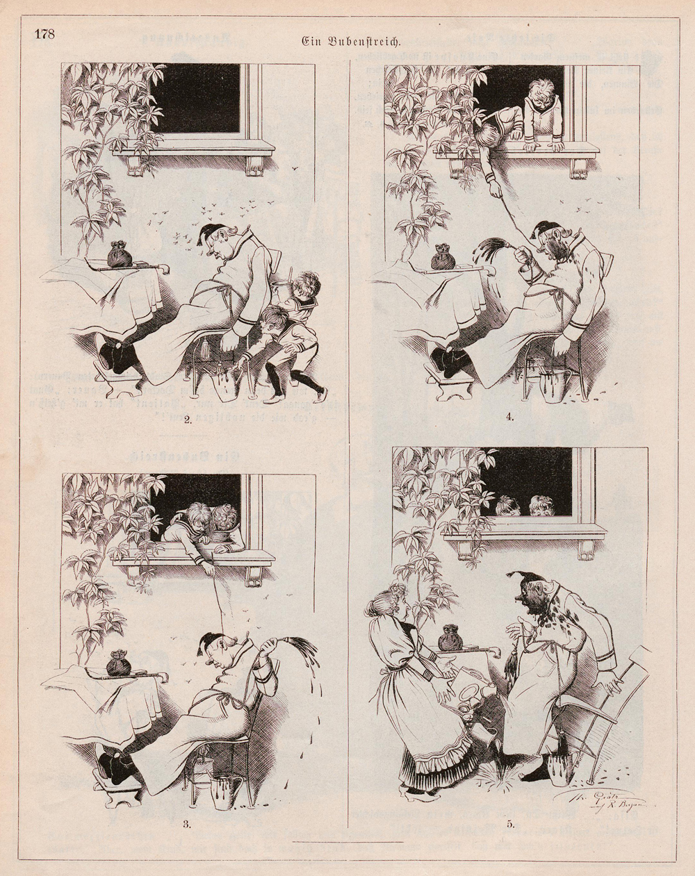 Dans le numéro précédent du Fliegende Blätter qui publie « Der verliebte Kürassier » (reproduit ci-dessus), se trouve une histoire sans paroles de Theodor Graetz, « Ein Bubenstreich » (FB, n° 2624, 1895) qui n’a pas non plus échappé aux frères Lumière. Ce gag, qui fut également publié dans les revues françaises la même année (4), a très probablement inspiré la vue n° 879 de 1897 intitulée Une farce (le pot de peinture) : deux farceurs trempent dans de peinture le bout du pompon de la ceinture d’un homme assoupi sur une chaise. Puis, ils lui chatouillent le visage. L’homme pense être importuné par des insectes qu’il chasse avec son pompon et se barbouille involontairement le visage de peinture. »