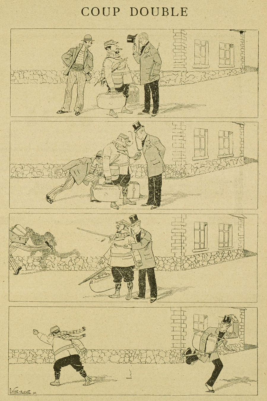 Le scénario du film Voyageur et voleurs (vue n° 121) de 1897 ressemble fortement à cette planche du bien-nommé Vide-Riche, parue dans la revue Le Pêle-Mêle de 1895 : « Afin de donner facilement du feu à un fumeur, un voyageur, tenant une valise dans chaque main, dépose à terre une de ses valises, qu’un voleur saisit. Pour mieux courir, le voyageur dépose sa deuxième valise que vient saisir un deuxième voleur de connivence avec le premier. Le voyageur s’aperçoit trop tard qu’il a été dupé. »