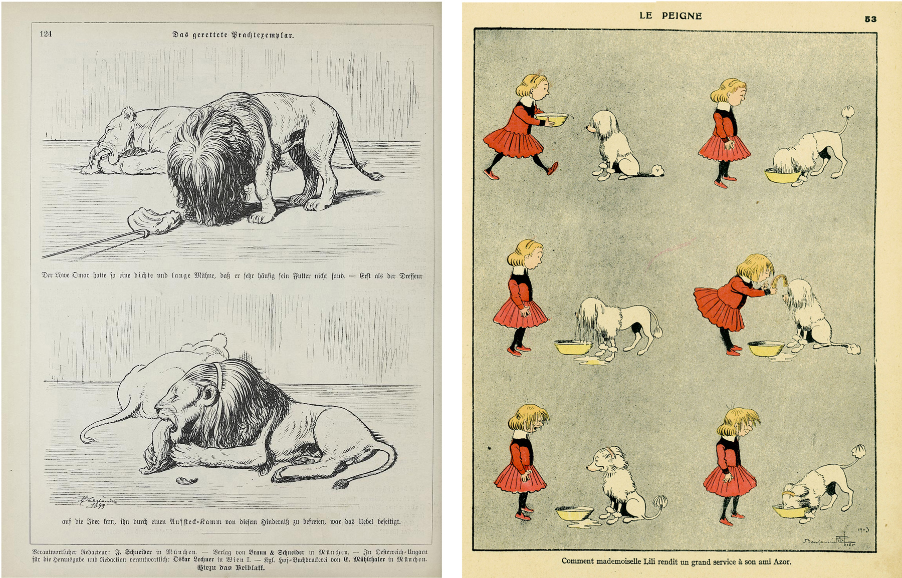 Benjamin Rabier n’a jamais caché l’influence déterminante qu’a eue la revue humoristique allemande Fliegende Blätter sur son style. Le jeune dessinateur y a collaboré à ses tout débuts, dans les années 1890. Il s’inspirera en retour des animaux humanisés et de la mécanique des gags imaginés par ses collègues allemands pour se forger un style personnel et trouver sa place dans la presse illustrée française. Certaines des planches que Rabier donna à l’Imagerie d’Épinal sont l’illustration même de ces mouvements d’influences et de réinterprétations qui s’opèrent des deux bords du Rhin et caractérisent plus généralement les histoires en images du XIXe siècle.