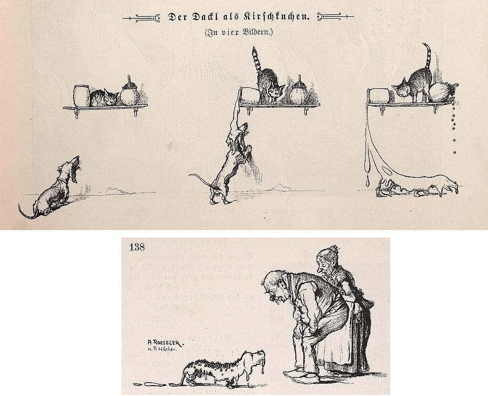 August Roeseler, « Der Dackel als Kirschkuchen » [Le teckel tarte aux cerises], Fliegende Blätter, n° 2903, 1901.