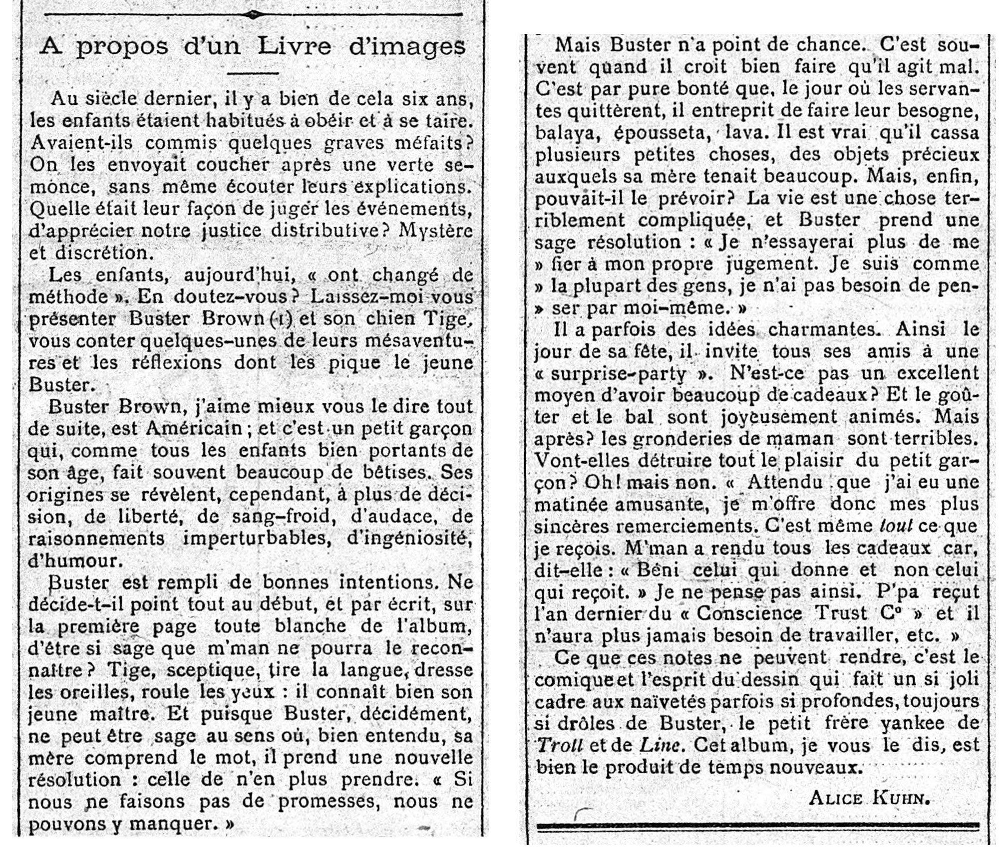 À la fin de l’année 1905, l’album américain Buster Brown, his dog Tige and their troubles (Frederick A. Stokes, 1904) est disponible chez la librairie anglophone Brentano’s de Paris. Ce recueil qui rassemble des strips de la série attire l’attention des journaux français. Dans le Journal des débats politiques et littéraires du 5 décembre 1905, Alice Kuhn, universitaire et journaliste  (5), écrit ce qui constitut probablement le premier article paru dans la presse française sur un album de bande dessinée. Son texte intitulé « À propos d’un Livre d’images » résume le principe et les personnages du strip, puis conclut : « Ce que ces notes ne peuvent rendre, c’est le comique et l’esprit du dessin qui fait un si joli cadre aux naïvetés parfois si profondes, toujours si drôles de Buster, le petit frère yankee de Trott et de Line  (6). Cet album, je vous le dis, est le produit de temps nouveaux. »