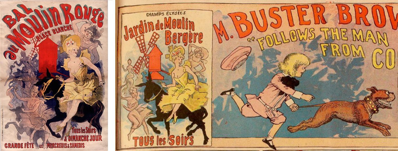 À gauche : Jules Chéret, Bal du Moulin rouge, affiche, 1889. Source : Gallica.bnf.fr ; à droite : Outcault, Buster Brown, extrait de la page du New York Journal, éd. européenne, 9 octobre 1904. Source : Gallica.bnf.fr