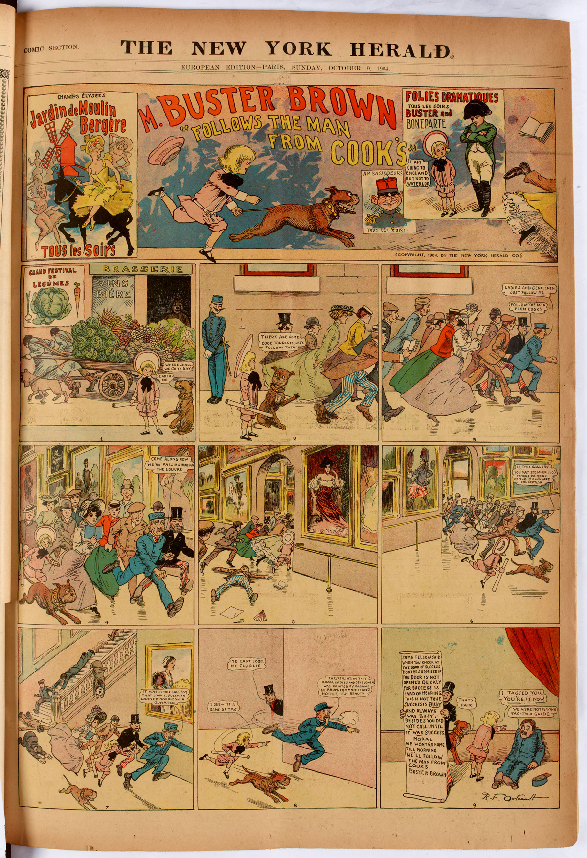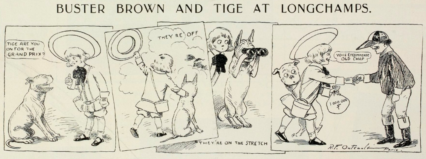 En 1904, c’est avec Buster Brown que le dessinateur américain fait le voyage dans la capitale française. La présence en France d’Outcault est attesté par un strip inédit qu’il donne au Paris Herald du 12 juin à l’occasion d’un évènement couvert par le quotidien : le Grand Prix de l’hippodrome de Longchamp. Dans cette courte bande dessinée, Buster et Tige assistent à la course et félicitent le jockey gagnant.