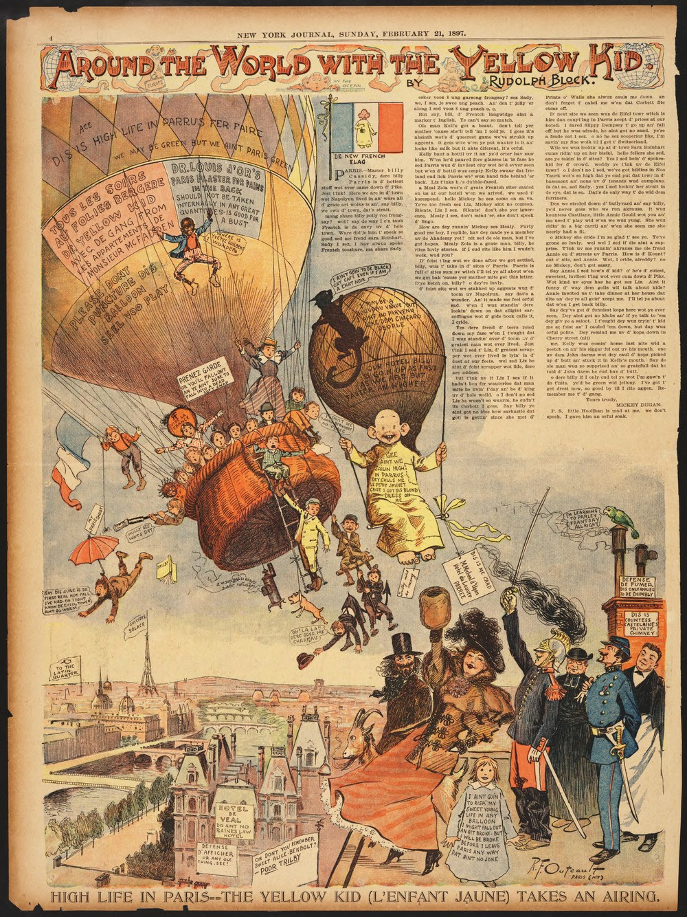 Quelques années après, Outcault reviendra en France et emportera ses personnages dans ses valises. En 1897, « Around the World With The Yellow Kid » à la suite de son séjour de quatre mois en Europe, avec Rudolph Block, le rédacteur en chef du supplément dominical du New York Journal, qui l’accompagne et écrit le texte de la série sous le nom de Mickey Dugan. Dans deux planches parues dans le New York Journal américain, le Yellow kid, rebaptisé « l’enfant jaune » pour l’occasion, se rend à Paris : il s’envole en ballon au-dessus des toits de la ville, puis fait une visite mouvementé du musée du Louvre  (17).
