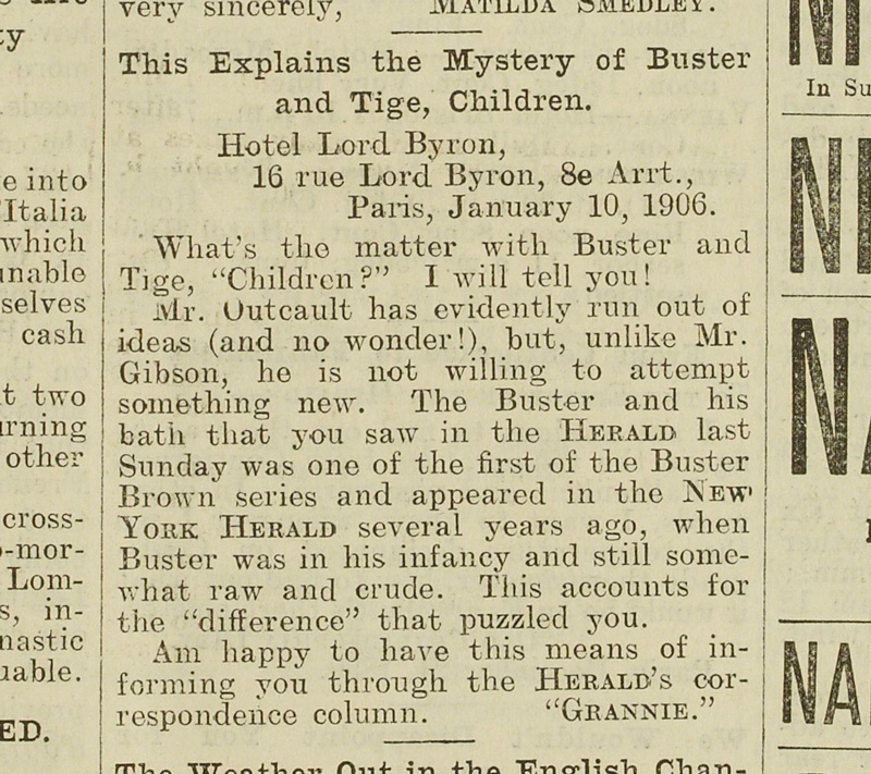 La publication de vieilles bandes de Buster Brown après le départ d’Outcault n’échappe pas à une lectrice parisienne qui se plaint auprès du Paris Herald :
