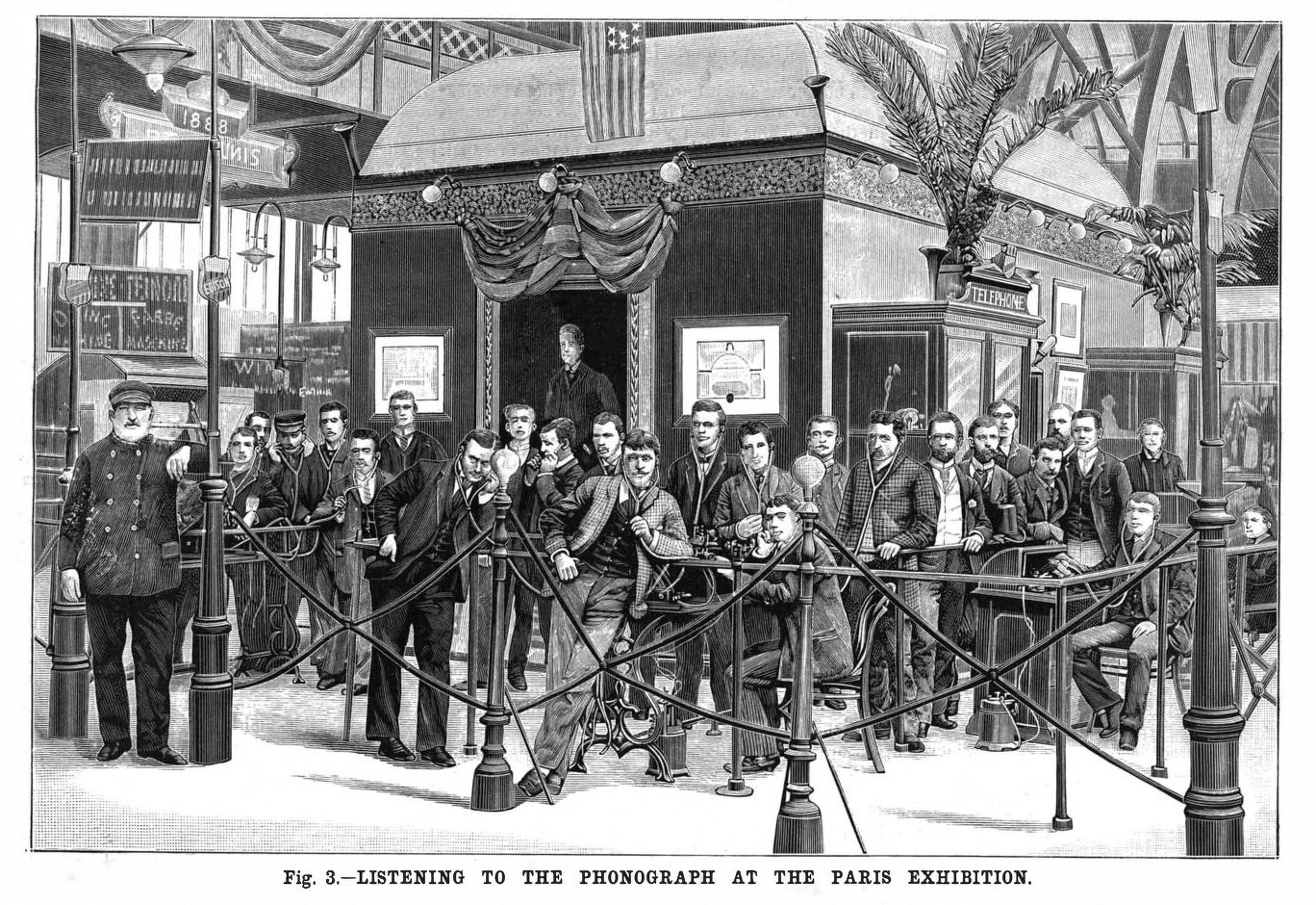 Richard F. Outcault (au centre, acoudé) photographié à Paris sur le stand d’Edison à l’Exposition de Paris en 1889. « Listening to the Phonograph at Paris Exhibition », Scientific American, 12 octobre 1889. Source : Archive.org
