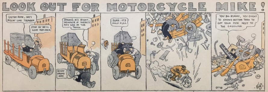 Les automobiles et autres engins motorisés ne sont pas des thèmes nouveaux dans les comic strips. Avant King, Winsor McCay, George Herriman ou encore Richard F. Outcault s’en sont emparés dans leurs séries pour en donner une « vision explosive », selon Benoît Crucifix  (11). La modernité des automobiles provoque une fascination sur les cartoonistes et le crash « fonctionne comme un gag burlesque, se présente comme inhérent à l’attraction de l’automobile, aux sensations de la conduite. Le potentiel véritablement destructeur de la technologie se voit désarmé par le rire ». Dans Motorcycle Mike, « il y a là indubitablement une certaine critique de cet aveuglement [du motard], du potentiel destructeur d’une machine lancée à pleine vitesse et qui semble incontrôlable ».