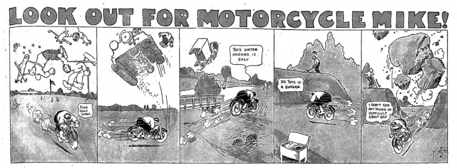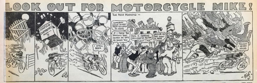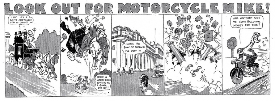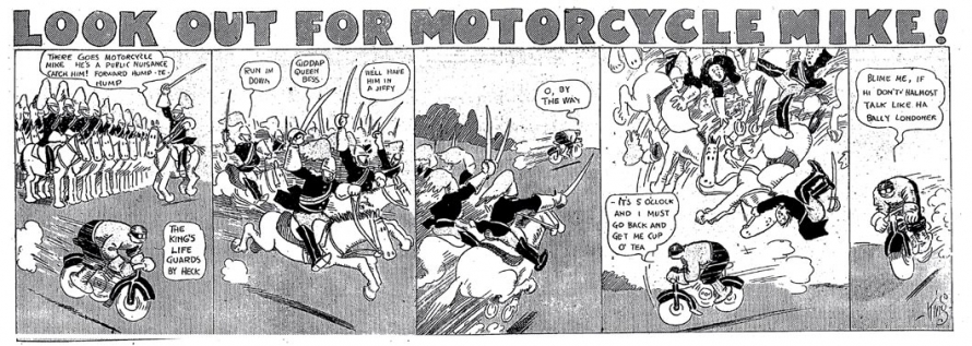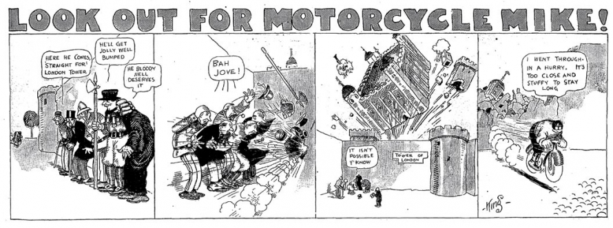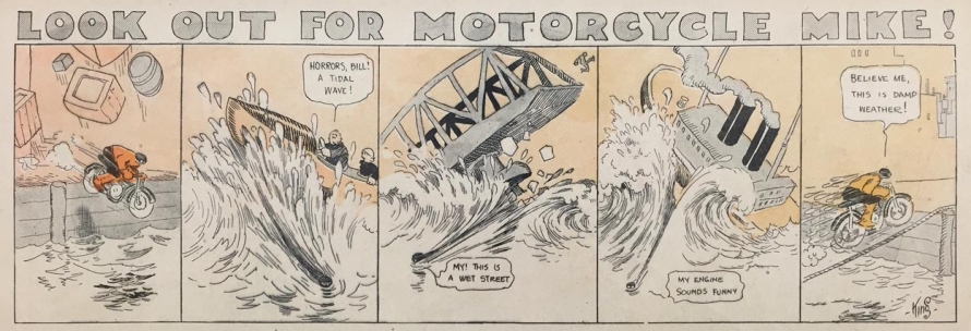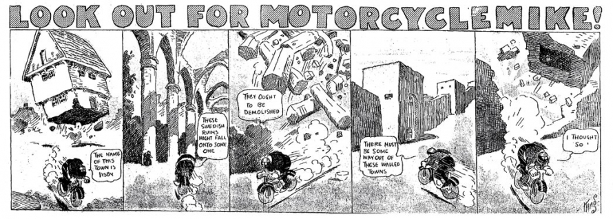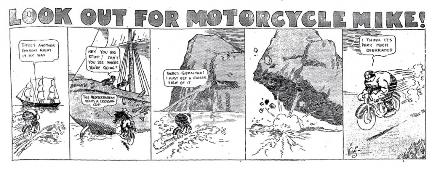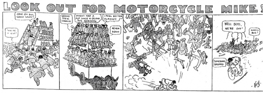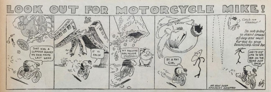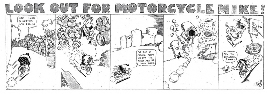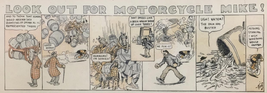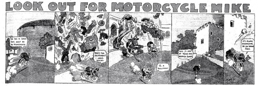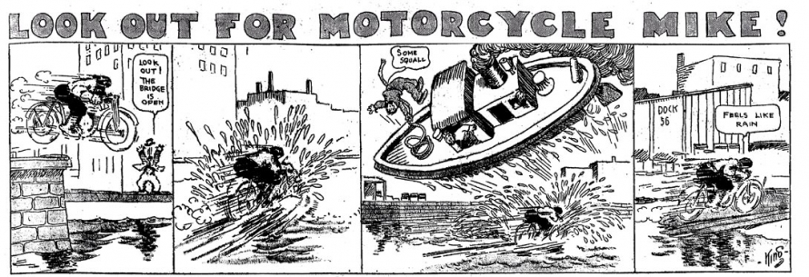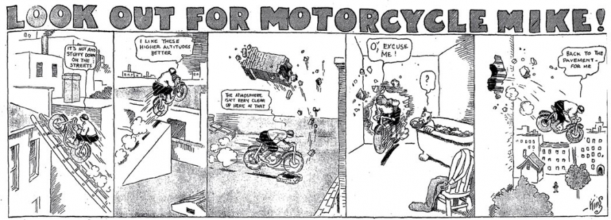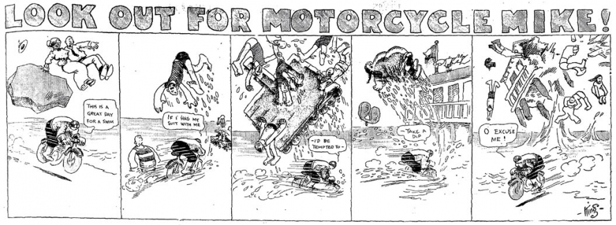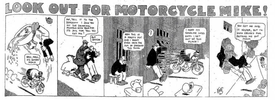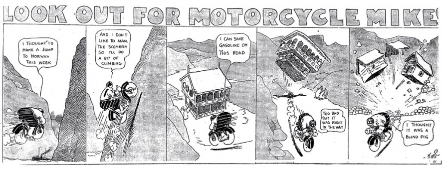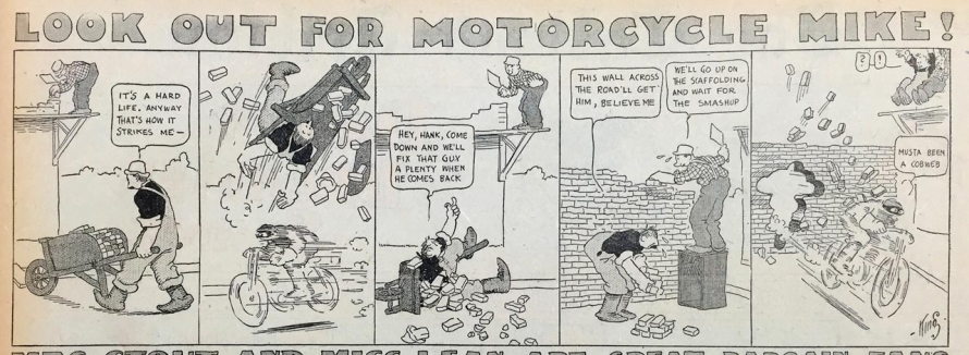 Le strip du 23 juin 1912 marque de façon humoristique la limite du motard imperturbable : défonçant un mur d’immeuble, Mike se retrouve dans une salle de bain où il surprend un homme nu dans sa baignoire. Pudique, Mike se cache les yeux d’une main (l’autre tient le guidon) et présente ses excuses au baigneur…