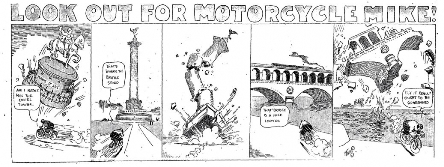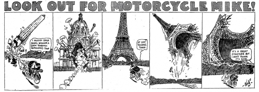 Après avoir rapidement traversé l’Espagne, Motorcycle Mike arrive en France dans l’épisode du 13 octobre 1912. Il y restera plus d’un mois, le temps de six strips. Son séjour français ne déroge pas à la règle : il commence sa visite par le château médiéval de Coucy, dont il perce aisément l’épaisse muraille, puis il arrive rapidement à Paris où son tableau de chasse s’allonge : Mike aligne dans son viseur tous les grands monuments de la capitale, de l’Arc de Triomphe de l’Étoile aux Invalides, en passant par le Moulin Rouge ou la colonne de la Bastille, avec bien évidement la Tour Eiffel en guise de bouquet final.