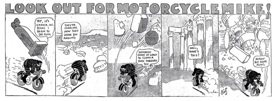 Cependant King semble passer la vitesse supérieure. La mécanique des comic strips de l’époque est déjà bien huilée : des personnages récurrents reprennent chaque semaine leur rôle pour rejouer la même comédie miniature. Avec Motorcycle Mike, King pousse ce dispositif à son extrême, épurant au maximum sa narration, répétant cette fuite en avant semaine après semaine, réduisant son strip à une dose hebdomadaire d’action débridée purement burlesque. L’important, ce n’est pas la destination, ni le voyage, c’est de tout détruire !