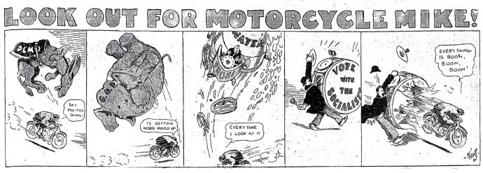 Si ce n’est la route devant lui, Motorcycle Mike n’a pas de ligne de conduite. Il agit au hasard des circonstances, mais son penchant anarchiste se révèle dans le strip du 5 mai 1912 : il renverse sans distinction tous les représentants des partis politiques que King met sur sa route, qu’ils soient démocrates, républicains, prohibitionnistes ou socialistes. « Everything is boom, boom, boom », lance Mike en passant à travers la grosse caisse d’un partisan.