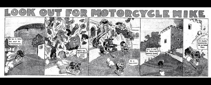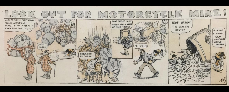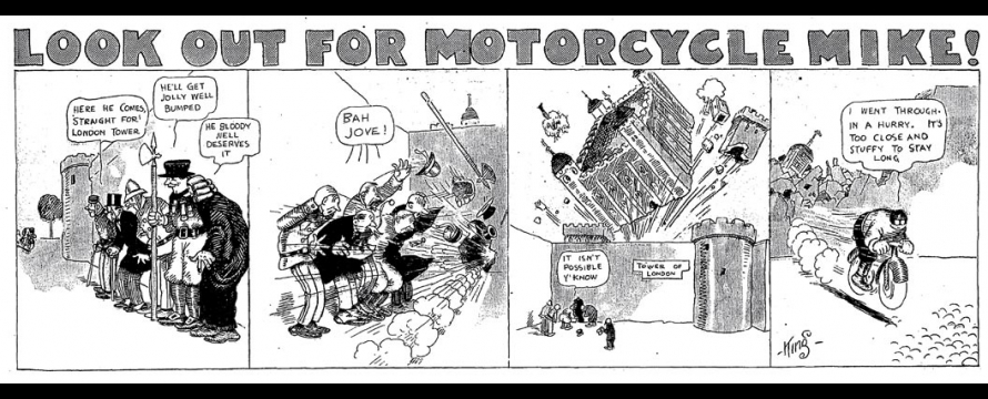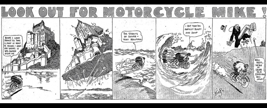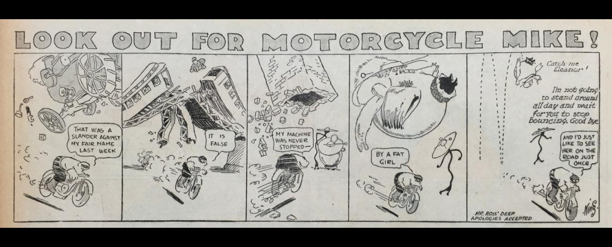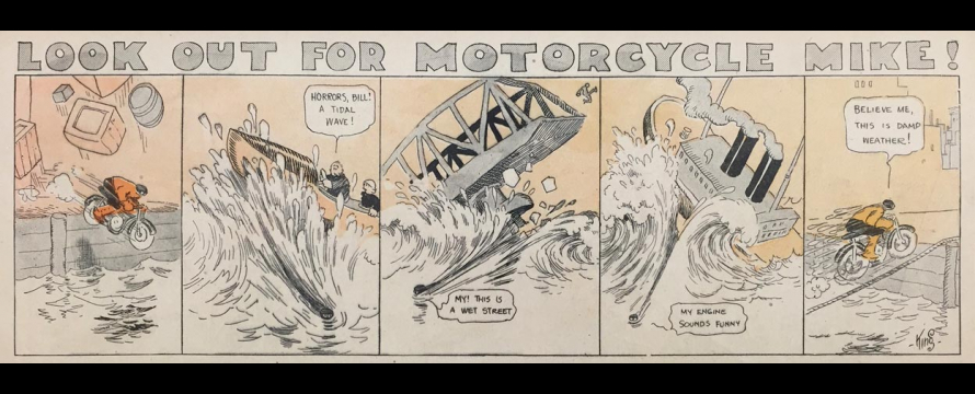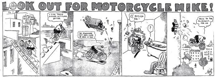Le strip du 23 juin 1912 marque de façon humoristique la limite du motard imperturbable : défonçant un mur d’immeuble, Mike se retrouve dans une salle de bain où il surprend un homme nu dans sa baignoire. Pudique, Mike se cache les yeux d’une main (l’autre tient le guidon) et présente ses excuses au baigneur…