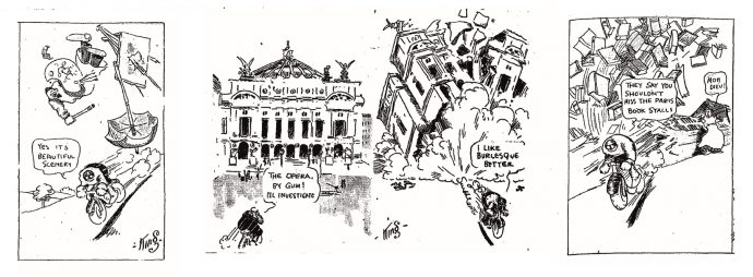 De gauche à droite : vignettes montrant Motorcycle Mike fauchant un peintre (3 novembre 1912), explosant l’Opéra Garnier (octobre 1912) et défonçant la boite d’un bouquiniste du bord de Seine (20 octobre 1912).