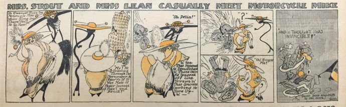 À ses débuts, Motorcycle Mike partage à égalité la page dominicale du Chicago Tribune avec trois autres strips, tous empilés les uns sous les autres. Frank King en signe souvent un ou deux autres (Young Teddy ou Honest Harnold, par exemple). Le quatrième est Mrs Stout and Miss Lean qui cohabite dès ses débuts avec le motard fou. Les gags de cette bande de Penny Ross reposent sur les physiques opposés de ses deux protagonistes, deux femmes de la grande bourgeoisie dont l’un est filiforme et l’autre tout en rondeurs. Dans l’édition du 14 janvier 1912, Ross fait intervenir Motorcycle Mike dans son strip qui est placé juste en-dessous de celui de King : alors que le duo féminin découvre, impressionné, les dégâts causés par le motard, celui-ci déboule derrière elles et s’écrase contre Mrs Stout. Mike a trouvé plus fort que lui… Dans la dernière case, en piteux état, il soupire, consterné : « And I thought I was invincible ».