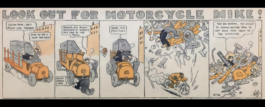 Les automobiles et autres engins motorisés ne sont pas des thèmes nouveaux dans les comic strips. Avant King, Winsor McCay, George Herriman ou encore Richard F. Outcault s’en sont emparés dans leurs séries pour en donner une « vision explosive », selon Benoît Crucifix  (11). La modernité des automobiles provoque une fascination sur les cartoonistes et le crash « fonctionne comme un gag burlesque, se présente comme inhérent à l’attraction de l’automobile, aux sensations de la conduite. Le potentiel véritablement destructeur de la technologie se voit désarmé par le rire ». Dans Motorcycle Mike, « il y a là indubitablement une certaine critique de cet aveuglement [du motard], du potentiel destructeur d’une machine lancée à pleine vitesse et qui semble incontrôlable ».