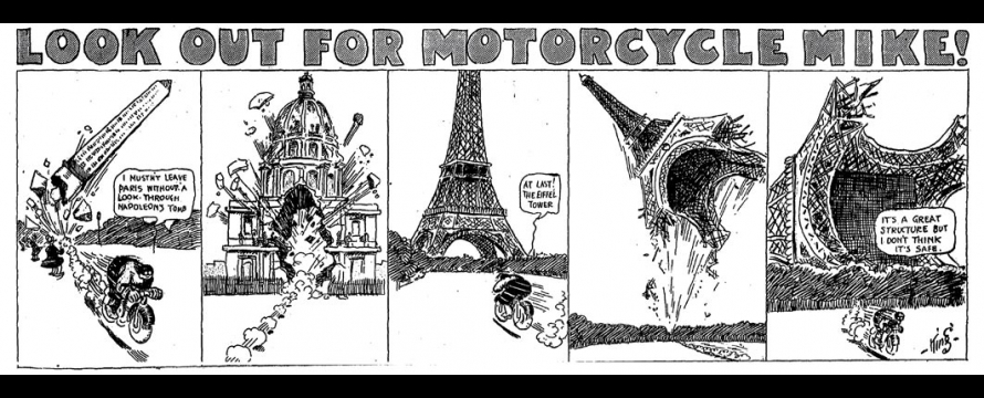 Après avoir rapidement traversé l’Espagne, Motorcycle Mike arrive en France dans l’épisode du 13 octobre 1912. Il y restera plus d’un mois, le temps de six strips. Son séjour français ne déroge pas à la règle : il commence sa visite par le château médiéval de Coucy, dont il perce aisément l’épaisse muraille, puis il arrive rapidement à Paris où son tableau de chasse s’allonge : Mike aligne dans son viseur tous les grands monuments de la capitale, de l’Arc de Triomphe de l’Étoile aux Invalides, en passant par le Moulin Rouge ou la colonne de la Bastille, avec bien évidement la Tour Eiffel en guise de bouquet final.