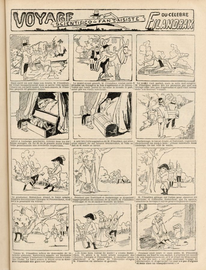 Lancé en 1902 par Jules Rouff, Mon Dimanche est un hebdomadaire qui s’inspire des magazines populaires anglais fourre-tout initiés par Tit-Bits. Son contenu hétéroclite était composé de nombreuses rubriques de format court : articles, nouvelles, contes, reportages, faits-divers, jeux, illustrations, dessins d’humour et donc histoires en images. Dans ce dernier genre qui nous intéresse, on trouve notamment des œuvres signées de Tybalt, Jean d’Aurian, Solar d’Alba ou encore Gog, mais leurs productions sont d’un faible intérêt. Mon Dimanche n’aurait pas plus attiré notre attention sans l’existence d’une page publiée dans son numéro du 2 octobre 1904 et intitulée « Voyage scientifico-fantaisiste du célèbre Filandrax ».