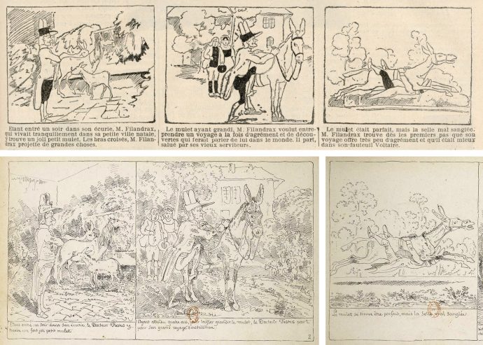 En haut : les quatre premières cases de l’aventure de M. Filandrax (1904) ;