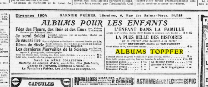 - À partir de 1860 et jusque dans les années 1930 environ, le catalogue de la maison Garnier Frères publie des rééditions des albums de Rodolphe Töpffer. Ceux-ci furent redessinées par son fils, François Töpffer, d’après les premiers albums autographiés.[↩]